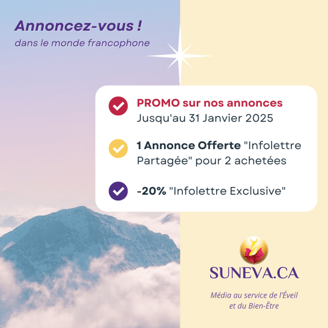 SUNEVA est une entreprise née en 2013 qui, à travers ses activités dans les domaines du bien-être, de la santé holistique et de l’éveil spirituel regroupe aujourd’hui plus de 60 000 abonnés, dont plus de 15 000 abonnés à l’infolettre. Pour faire connaître vos projets, services, événements ou produits à travers toute la francophonie, je vous propose un coup de pouce jusqu’au 31 janvier, pour vous annoncer cette année :