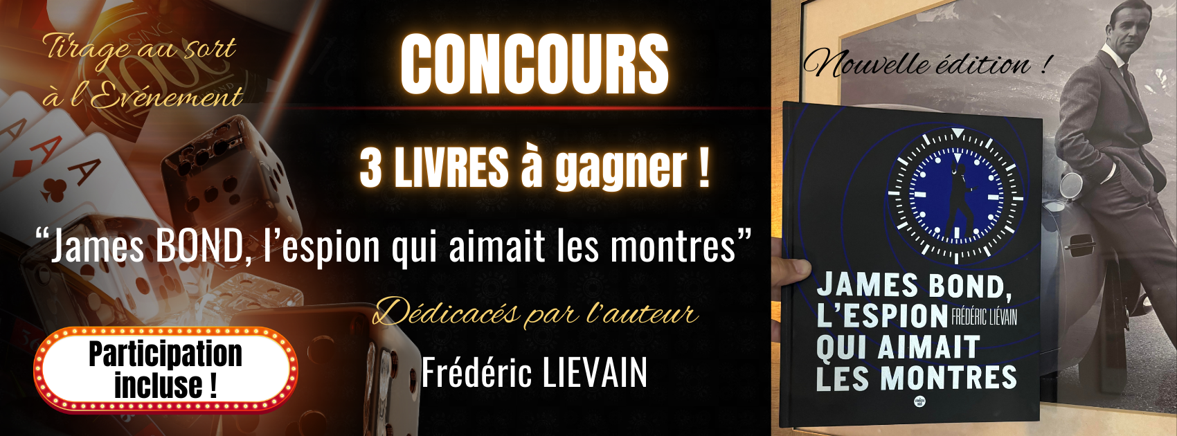 En participant à cet événement, vous ferez peut-être partie des 3 gagnants qui seront désignés par tirage au sort à l’événement. Ils recevront chacun la nouvelle édition collector actualisée 2025 du livre de Frédéric LIEVAIN : « James BOND, l’espion qui aimait les montres » qui vient paraître aux éditions Le Cherche Midi – série limitée à 3000 exemplaires numérotés. Bientôt disponible sur les plateformes de vente en ligne. (Pour le moment, les commandes de ce livre se font en message privé à l’auteur sur son instagram)