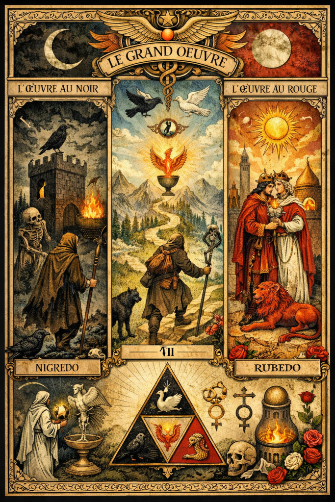 Cette quête alchimique trouve une représentation saisissante dans le Tarot, véritable miroir des mystères et de l’art des transmutations. Le mercure y est parfois représenté sous la forme d’un caméléon, « le lion rampant », symbole d’une matière unique capable de revêtir toutes les teintures de l’Oeuvre. À l’image du caméléon qui adopte la couleur de son environnement, cette substance initiale traverse les 21 opérations qui la séparent de la Pierre Philosophale, la Médecine Universelle, de l’éveil du Sage. Ainsi, les 7 couleurs sont les 7 régimes du feu secret des sages, des étapes d’une métamorphose intérieure, où l’ombre elle-même devient lumière.