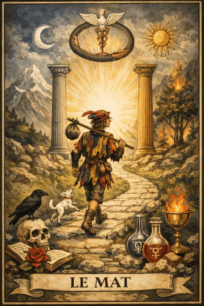 Car, en vérité, il n’existe qu’une seule matière en alchimie qui traverse toutes les épreuves, subissant toutes les transmutations. Et si le Mat n’a pas de nombre, c’est précisément parce qu’il est à la fois le commencement et l’aboutissement du Grand Oeuvre. Il incarne l’être inconstant et primitif qui, poussé par ses bas instincts – représentés par le chien qui pousse en avant – s’en va sans savoir où il va. Mais il peut aussi représenter à la fin du parcours l’initié accompli, libéré de toute entrave, marchant avec foi en la Connaissance divine, le regard tourné vers le ciel. Après avoir traversé les 21 épreuves, le Mat devient l’initié affranchi.